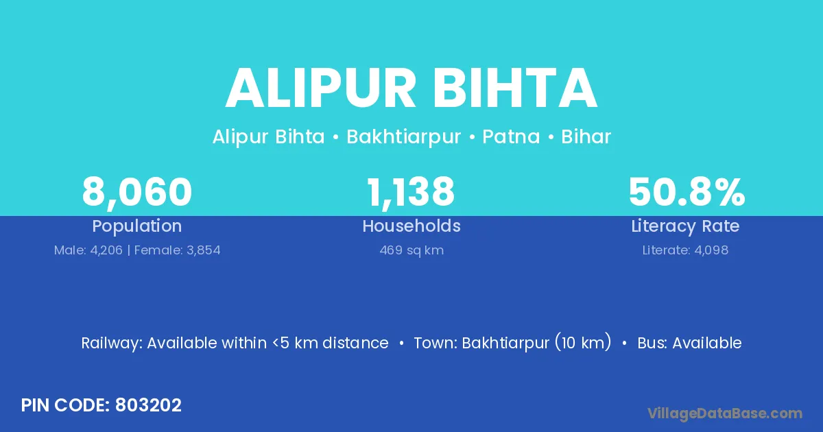 Bakhtiarpur (10 km) is the nearest town to Alipur Bihta village for major economic activities and is located approximately 10 km away.
