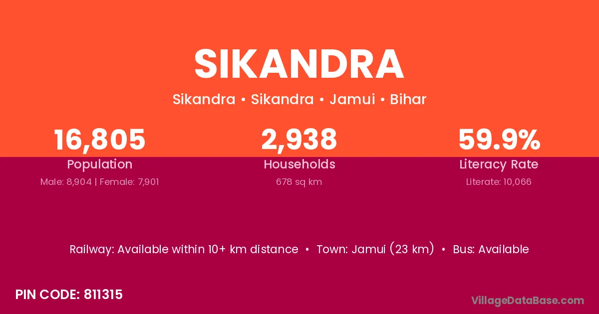 The literacy rate of Sikandra village is 39.76%. Male literacy stands at 45.70% and female literacy at 32.50%.