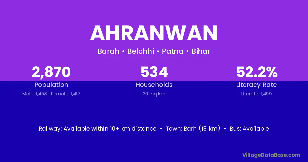 Barh (18 km) is the nearest town to Ahranwan village for major economic activities and is located approximately 18 km away.