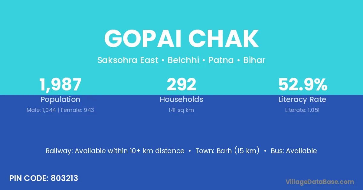 Gopai Chak village has a total population of 1,987 people, of which 1,044 are males and 943 are females.