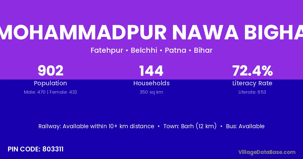 Mohammadpur Nawa Bigha village has a total population of 902 people, of which 470 are males and 432 are females.
