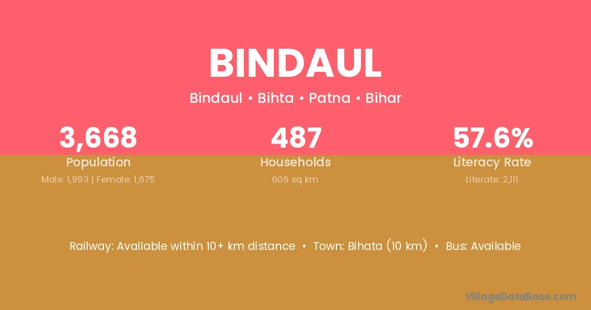 Bihata (10 km) is the nearest town to Bindaul village for major economic activities and is located approximately 10 km away.