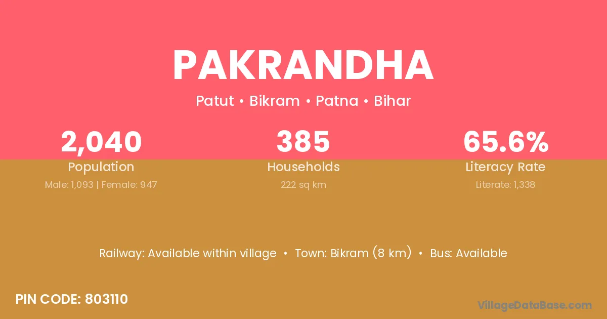 Bikram (8 km) is the nearest town to Pakrandha village for major economic activities and is located approximately 8 km away.