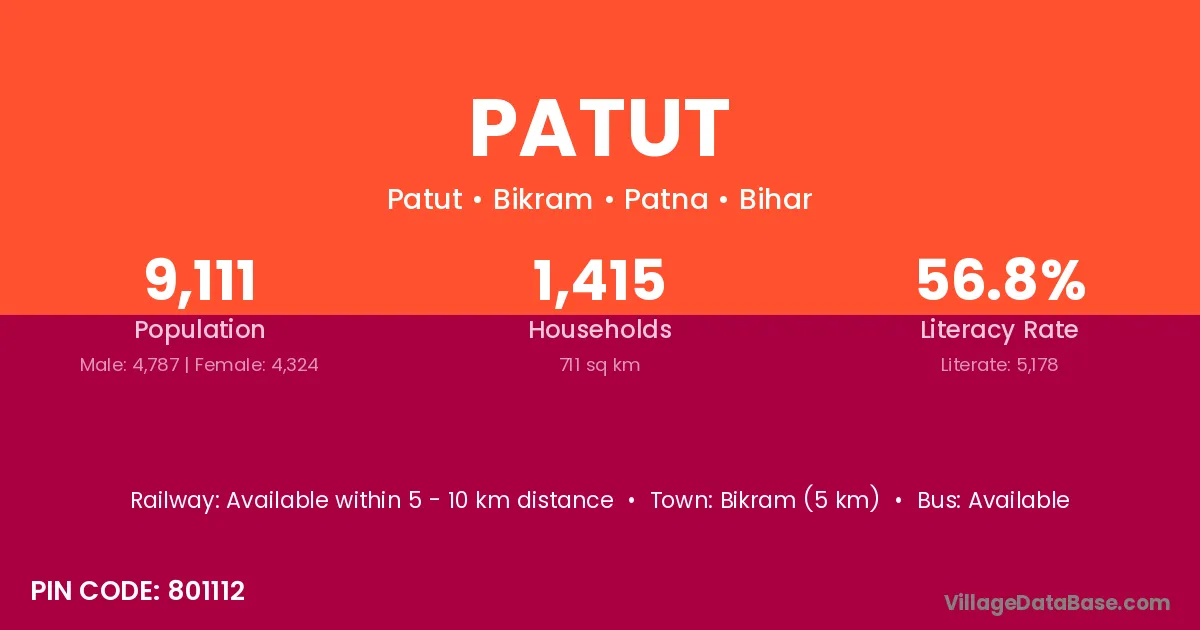 Bikram (5 km) is the nearest town to Patut village for major economic activities and is located approximately 5 km away.