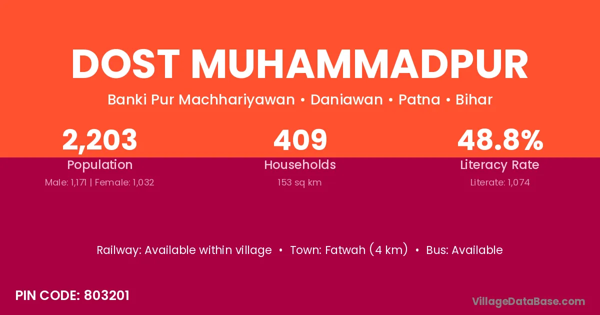 Dost Muhammadpur village has a total population of 2,203 people, of which 1,171 are males and 1,032 are females.