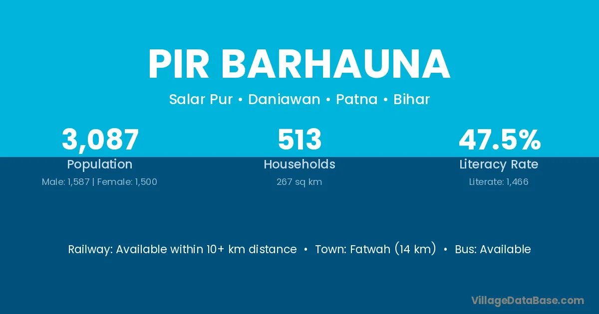 Fatwah (14 km) is the nearest town to Pir Barhauna village for major economic activities and is located approximately 14 km away.