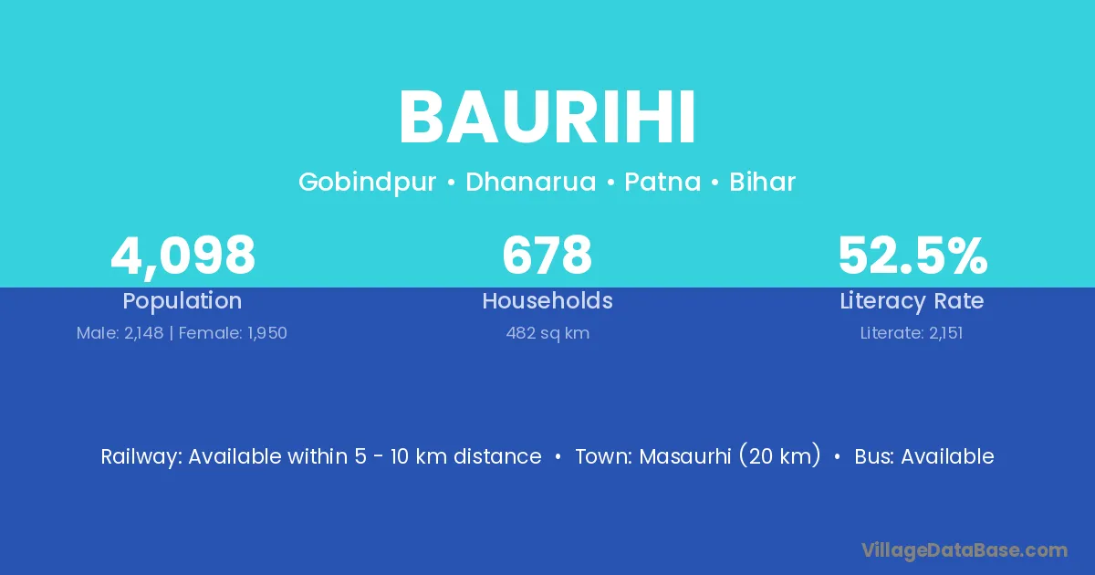 Masaurhi (20 km) is the nearest town to Baurihi village for major economic activities and is located approximately 20 km away.
