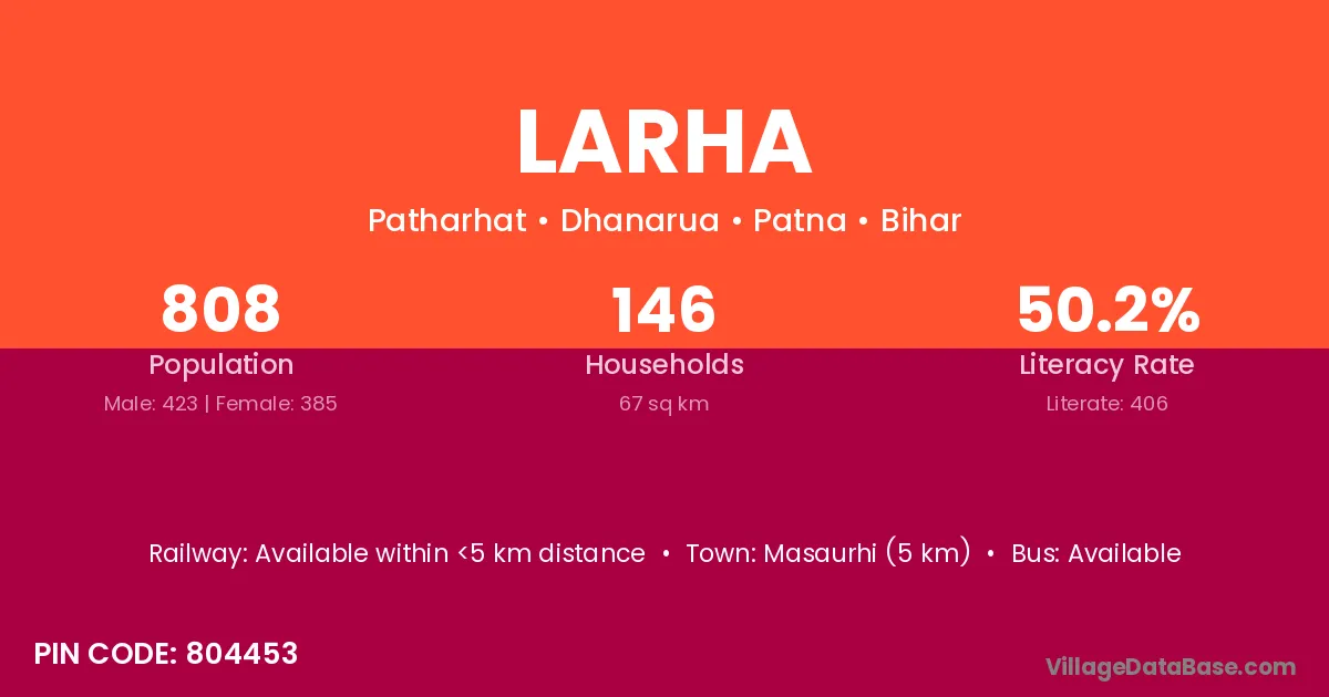 Masaurhi (5 km) is the nearest town to Larha village for major economic activities and is located approximately 5 km away.