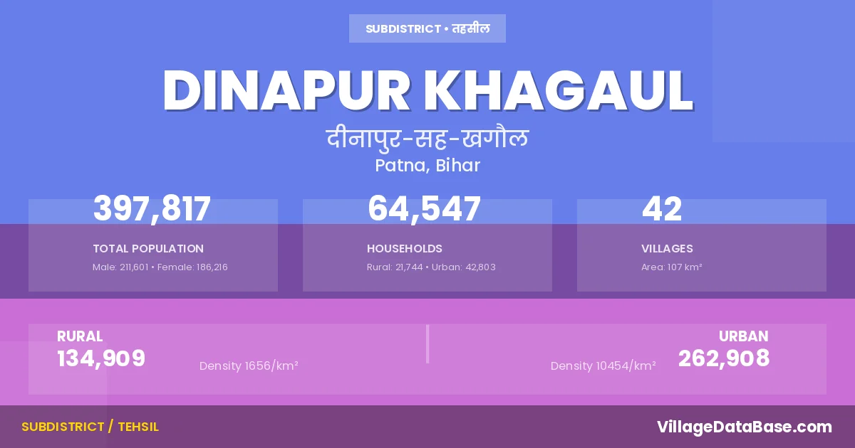 According to the 2011 census The total area of Dinapur Khagaul Subdivision is 107 km², with a population of 397817 people. The population density is 3,732 inhabitants per square kilometre, and there are approximately 64547 houses in the sub district.