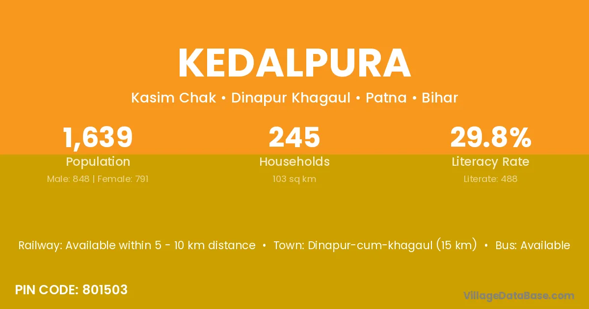 Dinapur-cum-khagaul (15 km) is the nearest town to Kedalpura village for major economic activities and is located approximately 15 km away.