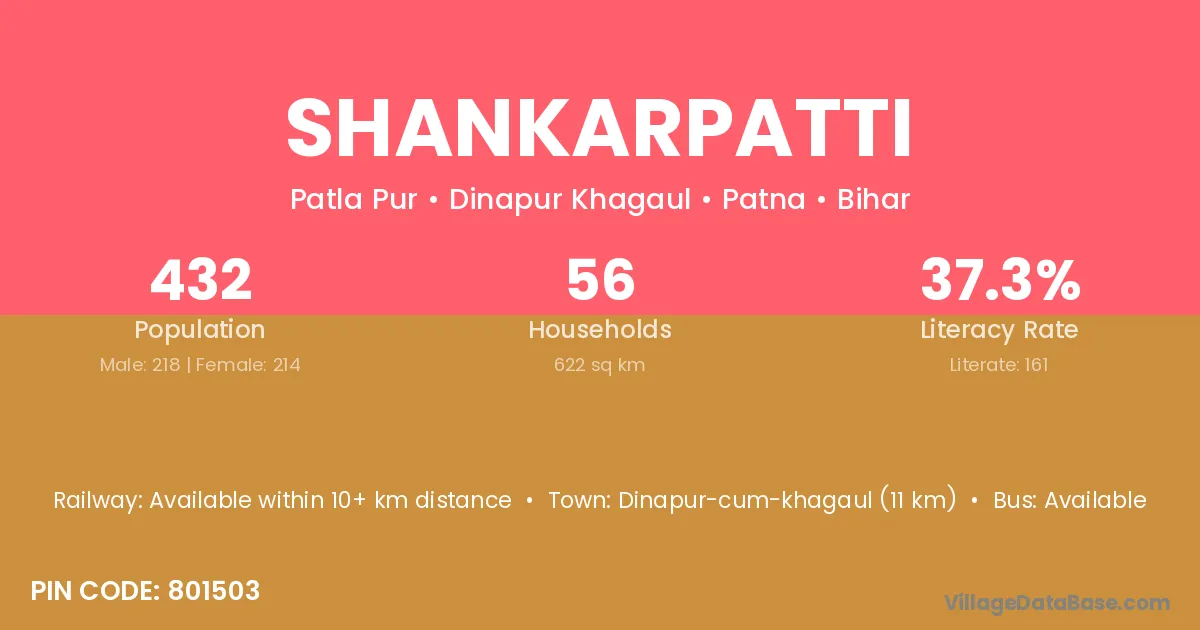 Shankarpatti village has a total population of 432 people, of which 218 are males and 214 are females.
