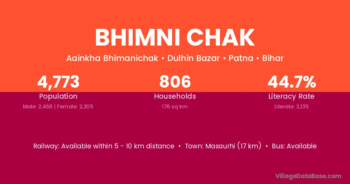 Masaurhi (17 km) is the nearest town to Bhimni Chak village for major economic activities and is located approximately 17 km away.