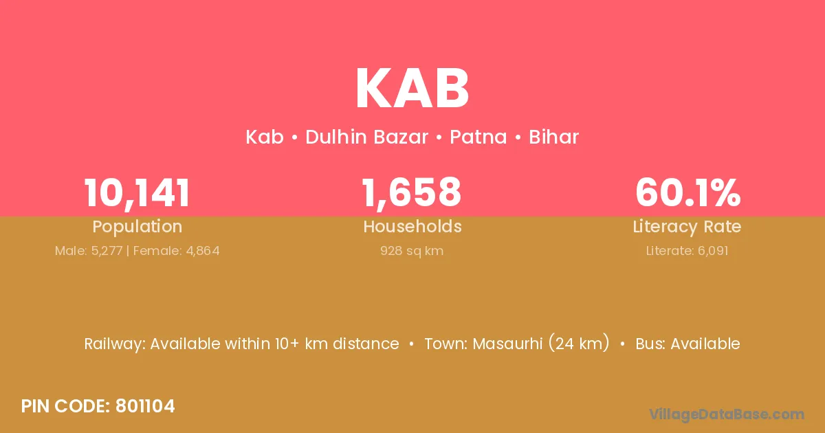 Masaurhi (24 km) is the nearest town to Kab village for major economic activities and is located approximately 24 km away.
