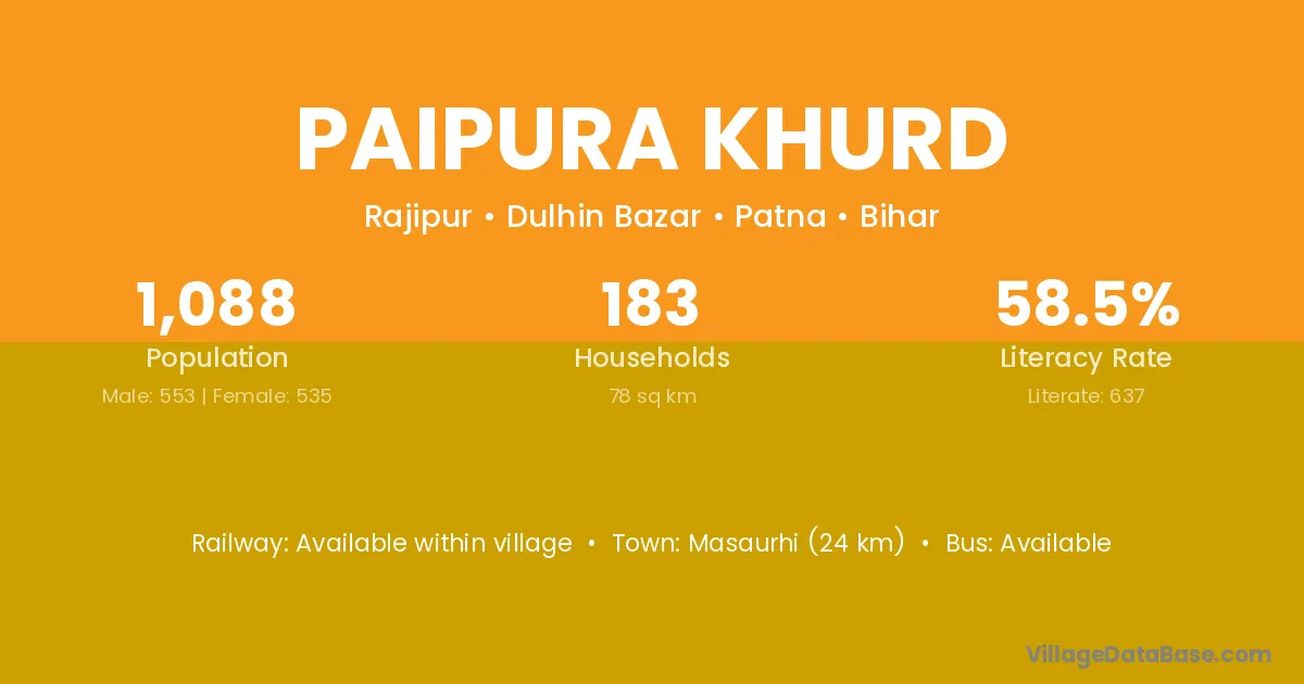 Masaurhi (24 km) is the nearest town to Paipura Khurd village for major economic activities and is located approximately 24 km away.