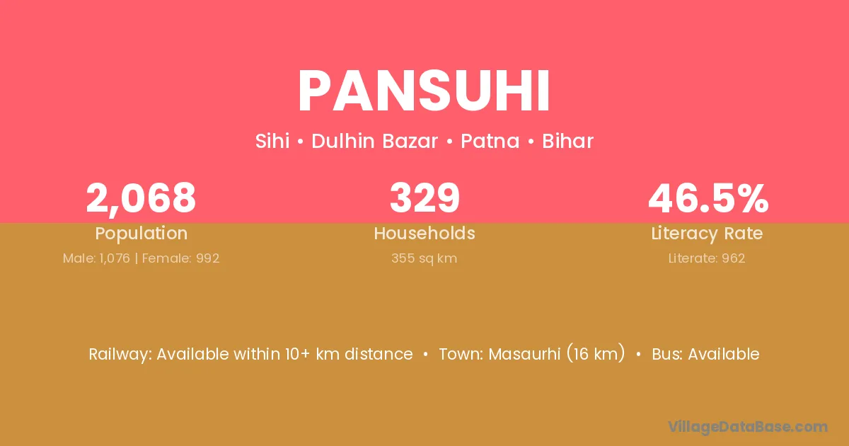 Masaurhi (16 km) is the nearest town to Pansuhi village for major economic activities and is located approximately 16 km away.