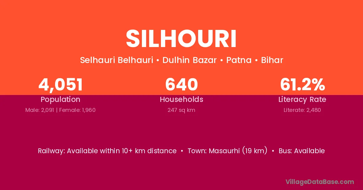Masaurhi (19 km) is the nearest town to Silhouri village for major economic activities and is located approximately 19 km away.