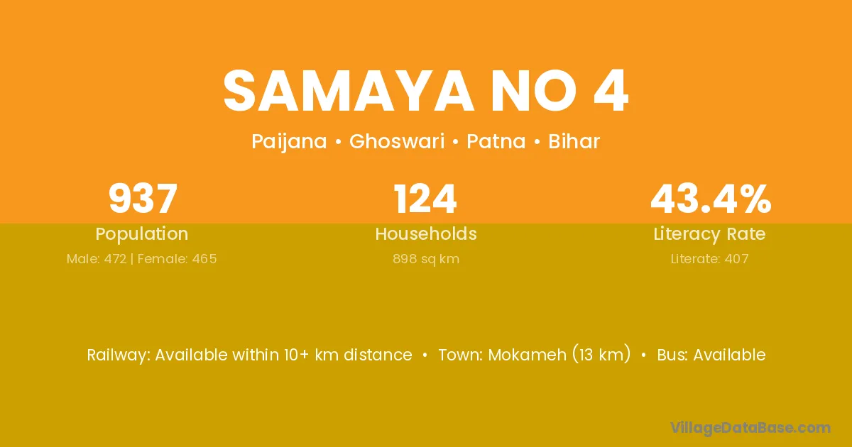 Samaya No 4 village has a total population of 937 people, of which 472 are males and 465 are females.