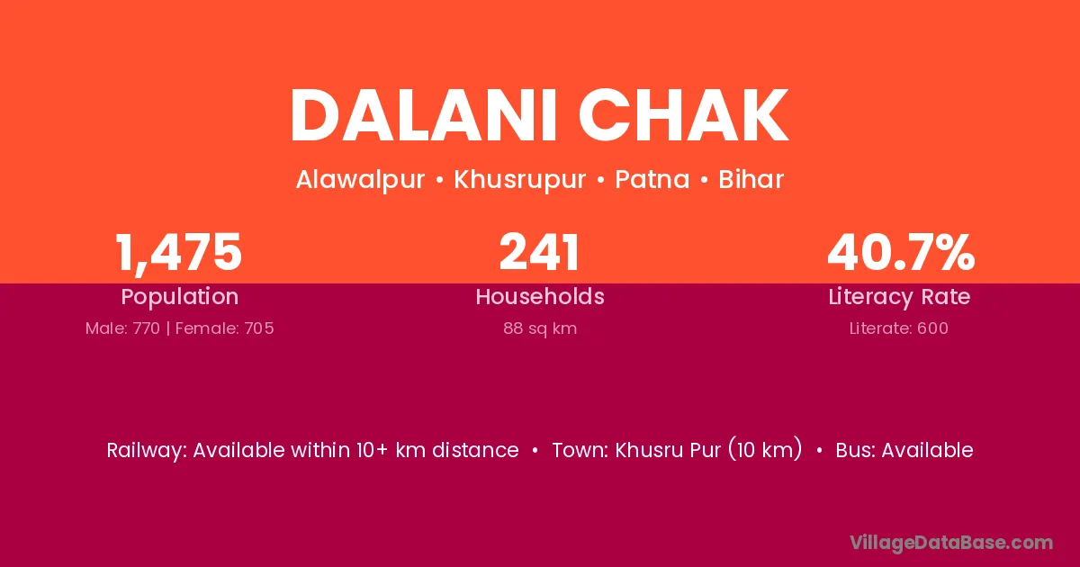 Khusru Pur (10 km) is the nearest town to Dalani Chak village for major economic activities and is located approximately 10 km away.