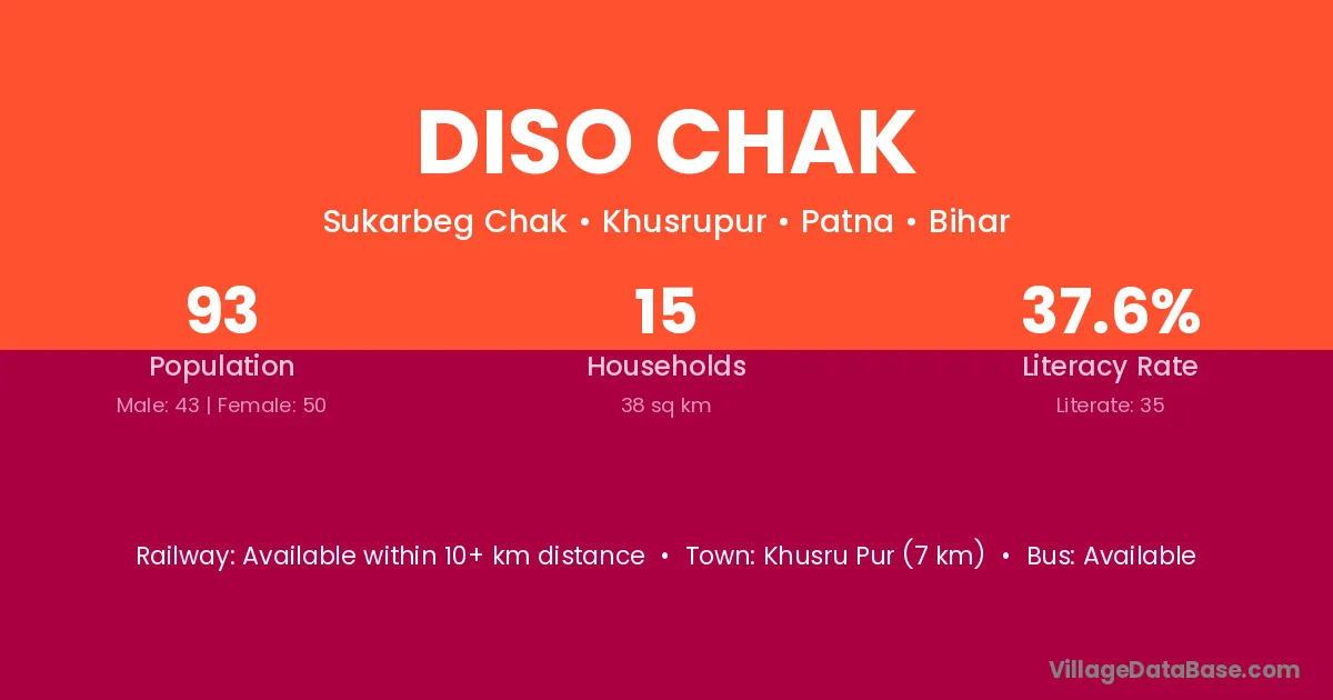 Khusru Pur (7 km) is the nearest town to Diso Chak village for major economic activities and is located approximately 7 km away.