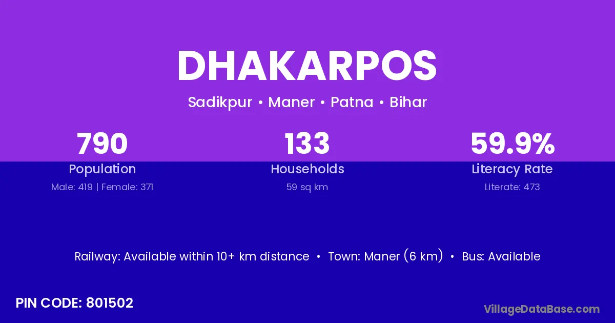 Maner (6 km) is the nearest town to Dhakarpos village for major economic activities and is located approximately 6 km away.