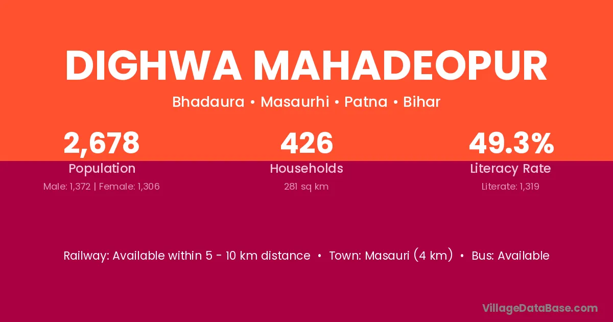 Masauri (4 km) is the nearest town to Dighwa Mahadeopur village for major economic activities and is located approximately 4 km away.