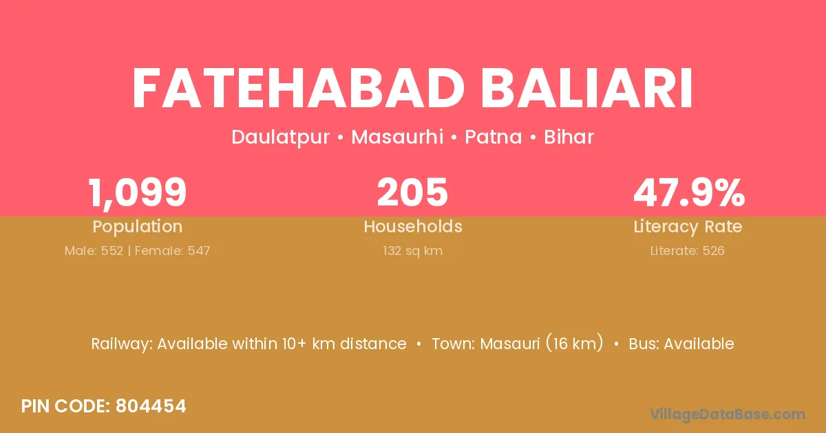 Fatehabad Baliari village has a total population of 1,099 people, of which 552 are males and 547 are females.