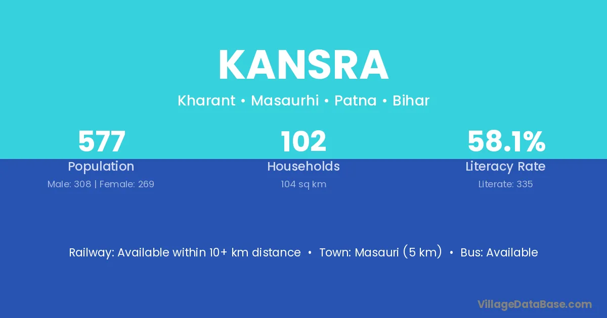 Kansra village has a total population of 577 people, of which 308 are males and 269 are females.