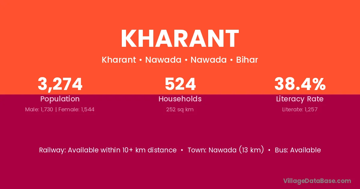 The literacy rate of Kharant village is 48.66%. Male literacy stands at 59.97% and female literacy at 36.43%.