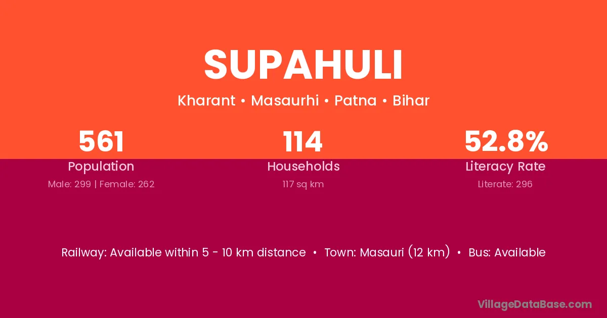 Supahuli village has a total population of 561 people, of which 299 are males and 262 are females.