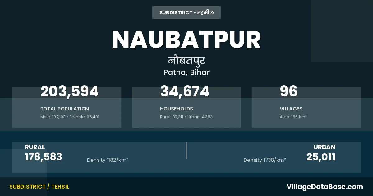 According to the 2011 census The total area of Naubatpur Subdivision is 166 km², with a population of 203594 people. The population density is 1,230 inhabitants per square kilometre, and there are approximately 34674 houses in the sub district.