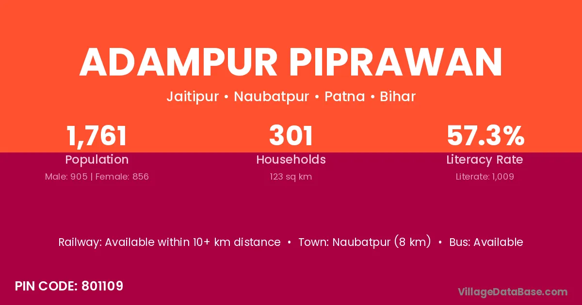Naubatpur (8 km) is the nearest town to Adampur Piprawan village for major economic activities and is located approximately 8 km away.