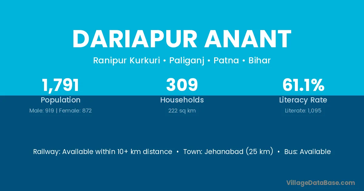 Jehanabad (25 km) is the nearest town to Dariapur Anant village for major economic activities and is located approximately 25 km away.