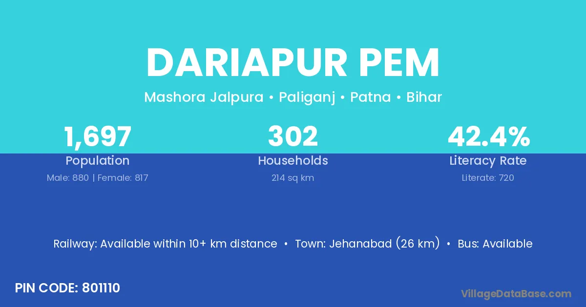 Jehanabad (26 km) is the nearest town to Dariapur Pem village for major economic activities and is located approximately 26 km away.