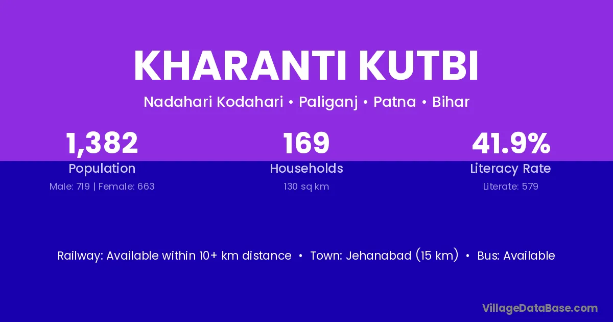 Jehanabad (15 km) is the nearest town to Kharanti Kutbi village for major economic activities and is located approximately 15 km away.