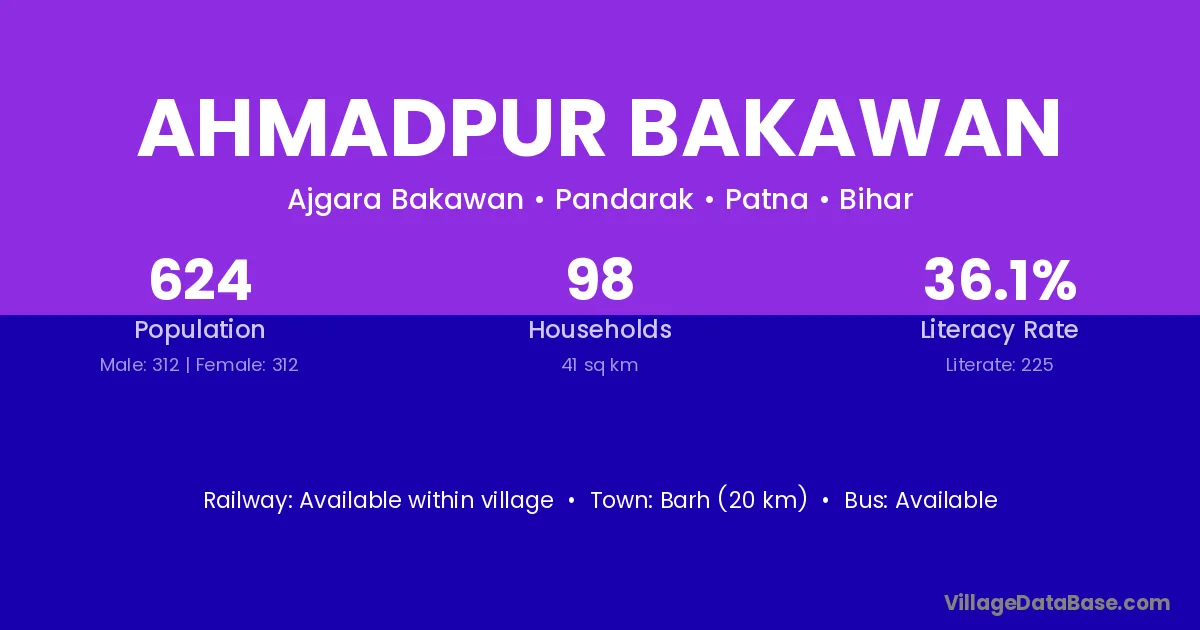 Barh (20 km) is the nearest town to Ahmadpur Bakawan village for major economic activities and is located approximately 20 km away.