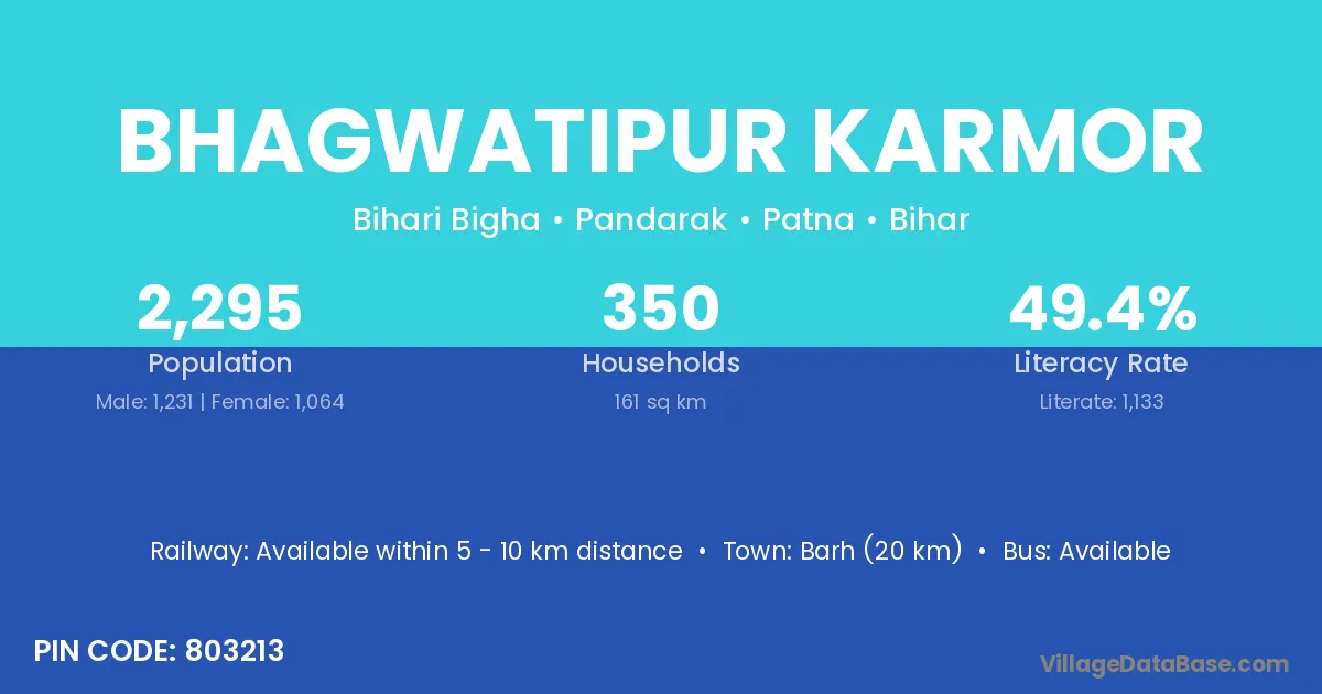 Barh (20 km) is the nearest town to Bhagwatipur Karmor village for major economic activities and is located approximately 20 km away.