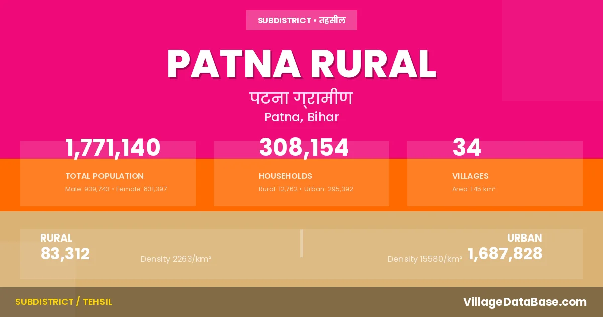 According to the 2011 census The total area of Patna Rural Subdivision is 145 km², with a population of 1771140 people. The population density is 12,202 inhabitants per square kilometre, and there are approximately 308154 houses in the sub district.