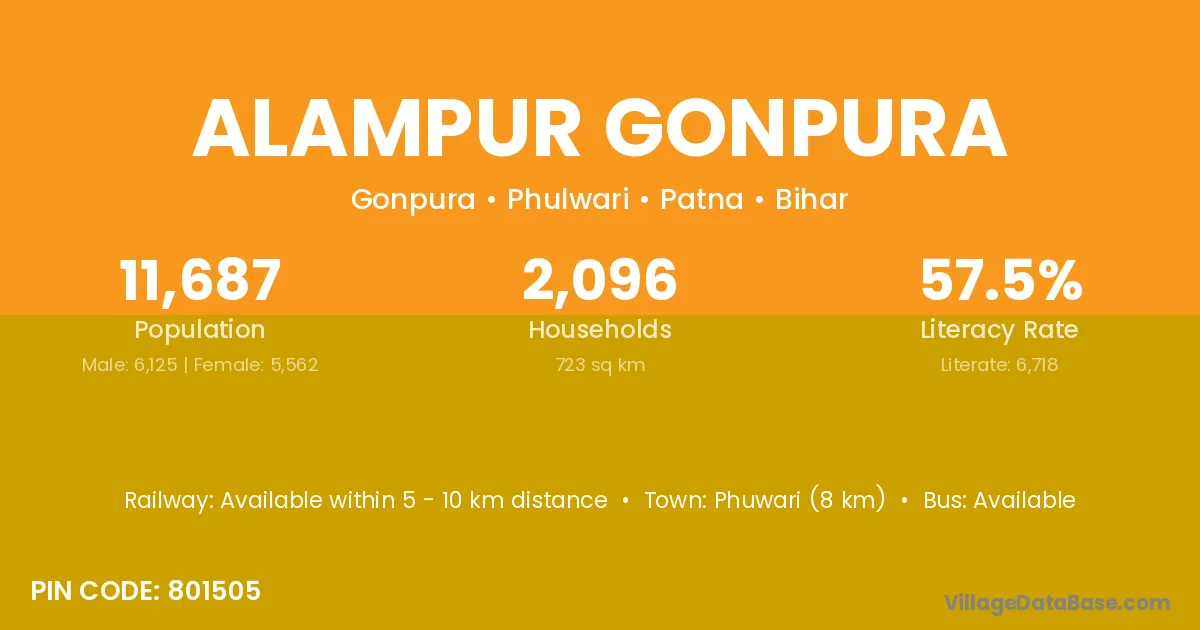 Phuwari (8 km) is the nearest town to Alampur Gonpura village for major economic activities and is located approximately 8 km away.