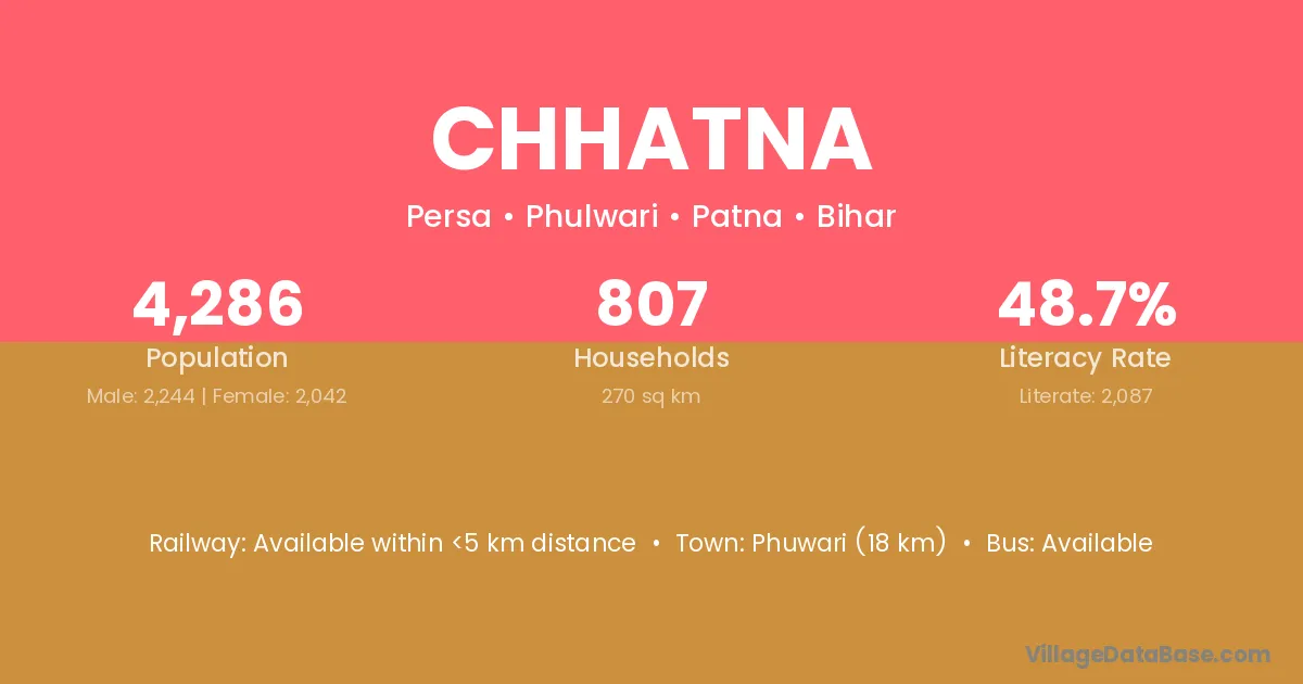 Phuwari (18 km) is the nearest town to Chhatna village for major economic activities and is located approximately 18 km away.