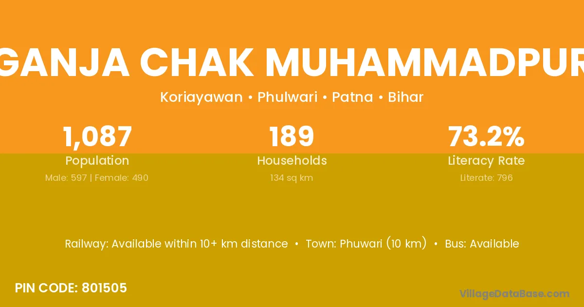 Ganja Chak Muhammadpur village has a total population of 1,087 people, of which 597 are males and 490 are females.
