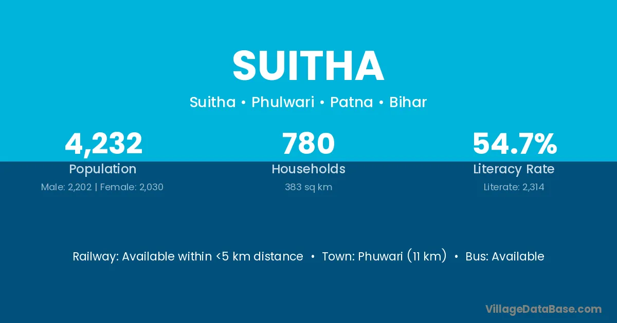 Suitha village has a total population of 4,232 people, of which 2,202 are males and 2,030 are females.