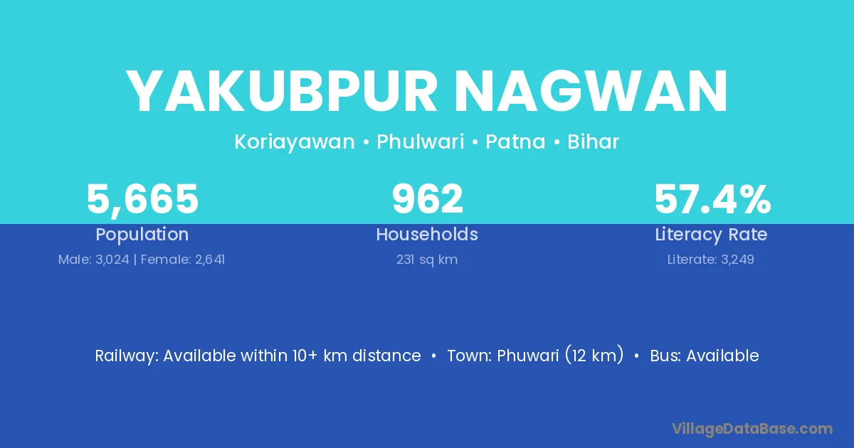 Yakubpur Nagwan village has a total population of 5,665 people, of which 3,024 are males and 2,641 are females.