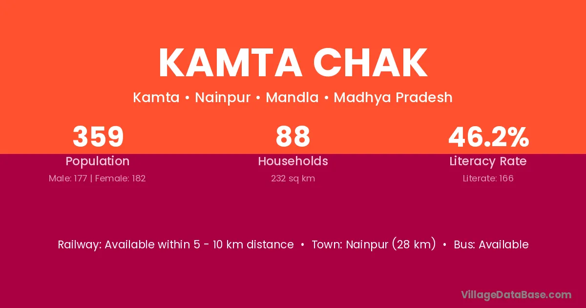 Kamta Chak village has a total population of 910 people, of which 491 are males and 419 are females.