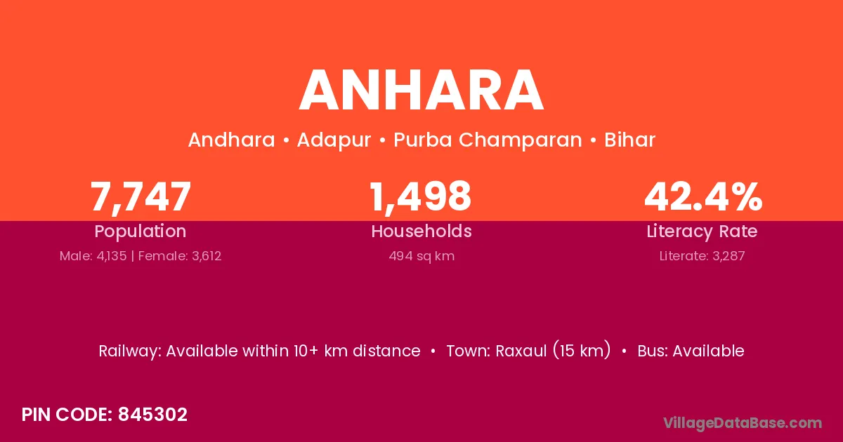 Raxaul (15 km) is the nearest town to Anhara village for major economic activities and is located approximately 15 km away.