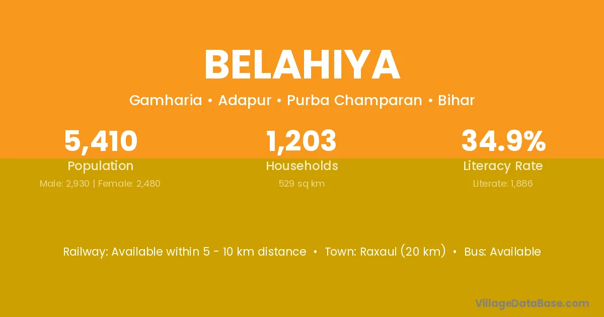Raxaul (20 km) is the nearest town to Belahiya village for major economic activities and is located approximately 20 km away.