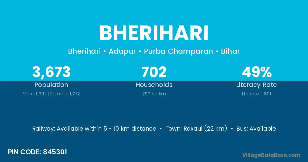 Raxaul (22 km) is the nearest town to Bherihari village for major economic activities and is located approximately 22 km away.