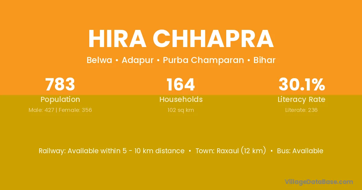 Raxaul (12 km) is the nearest town to Hira Chhapra village for major economic activities and is located approximately 12 km away.
