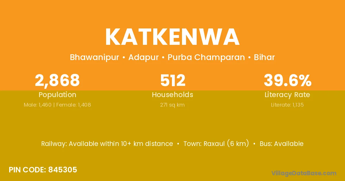 Raxaul (6 km) is the nearest town to Katkenwa village for major economic activities and is located approximately 6 km away.