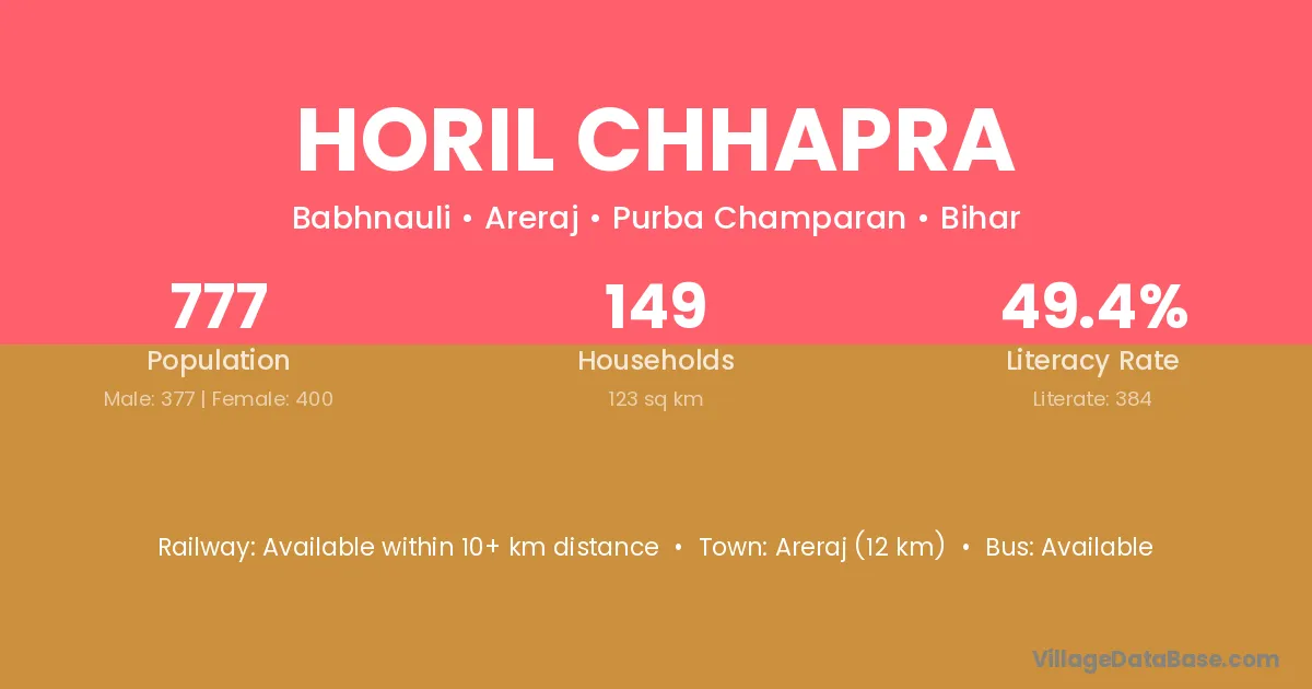 Horil Chhapra village has a total population of 777 people, of which 377 are males and 400 are females.