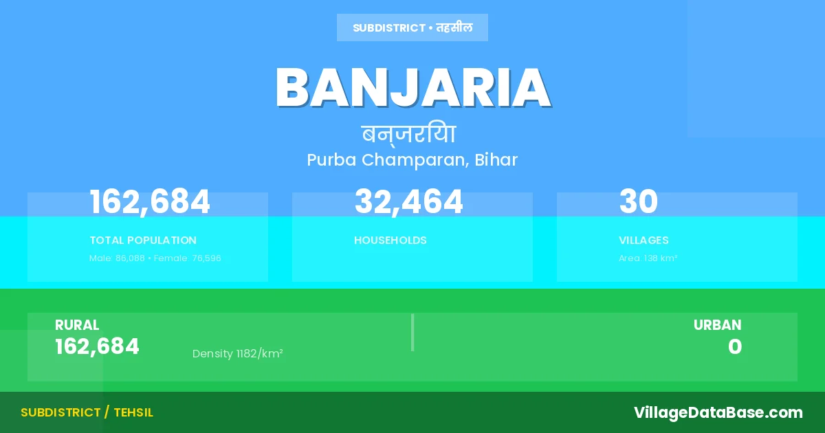 Banjaria is a town and Subdivision in the Purba Champaran district of the Bihar. In India, a Subdivision is a subdivision of a district responsible for the administration and revenue collection of a specific area within the district. Subdivisions play a crucial role in the local governance structure, contributing significantly to the development and administration of their communities.